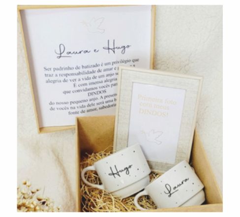 CÓD: CCD030Caixa de MDF Convite Dindos c/2 Canecas 325ml Casamento e Batizados